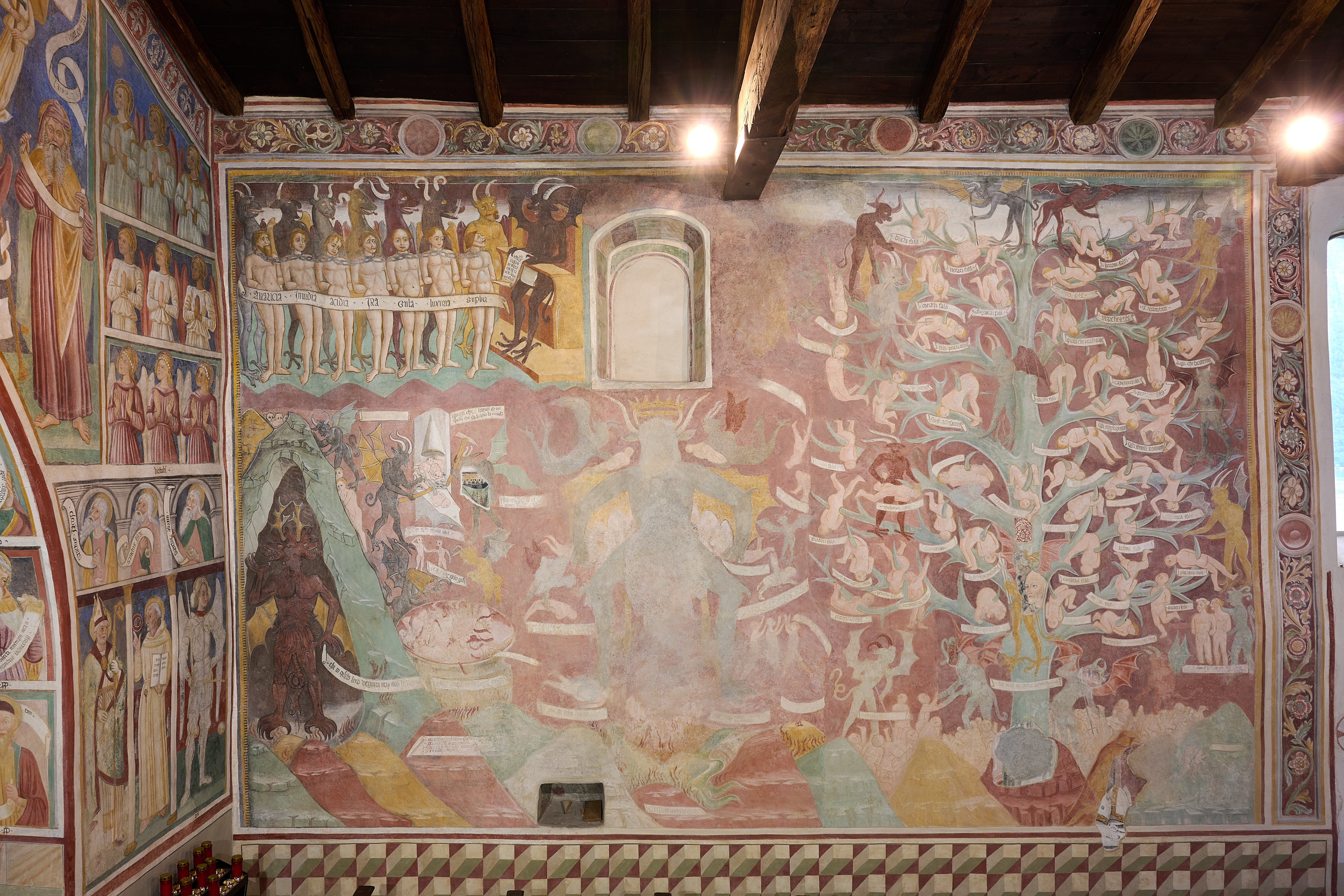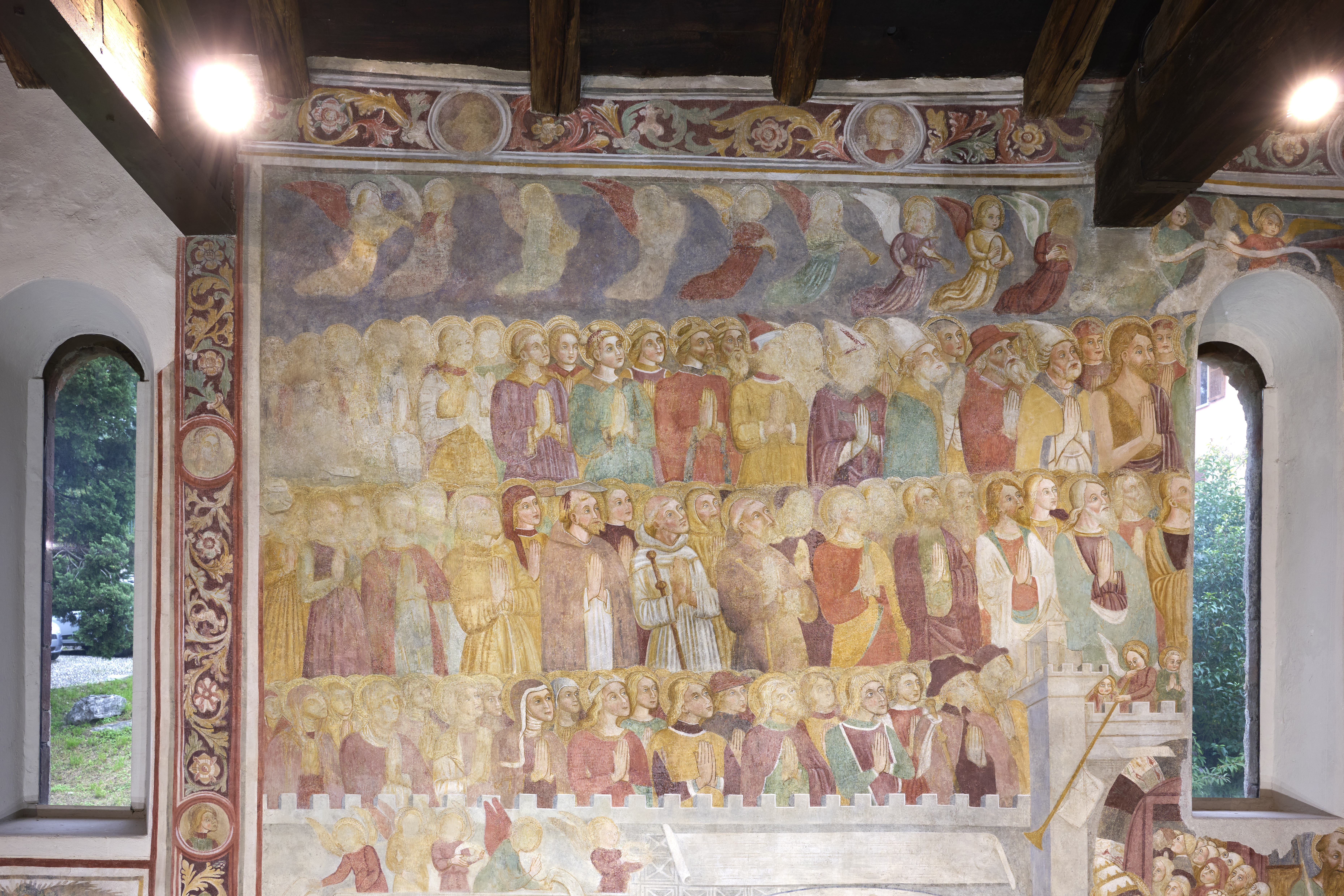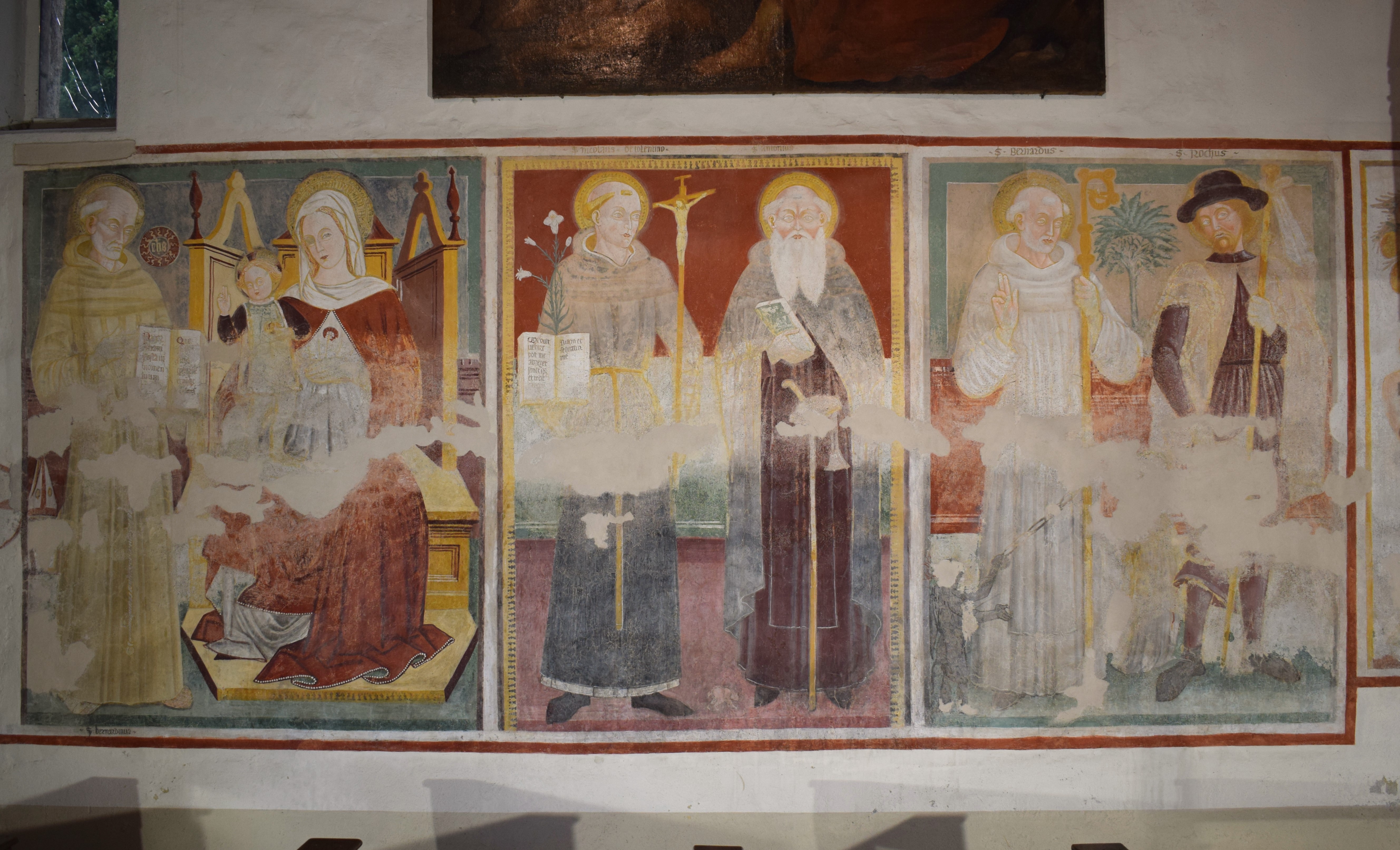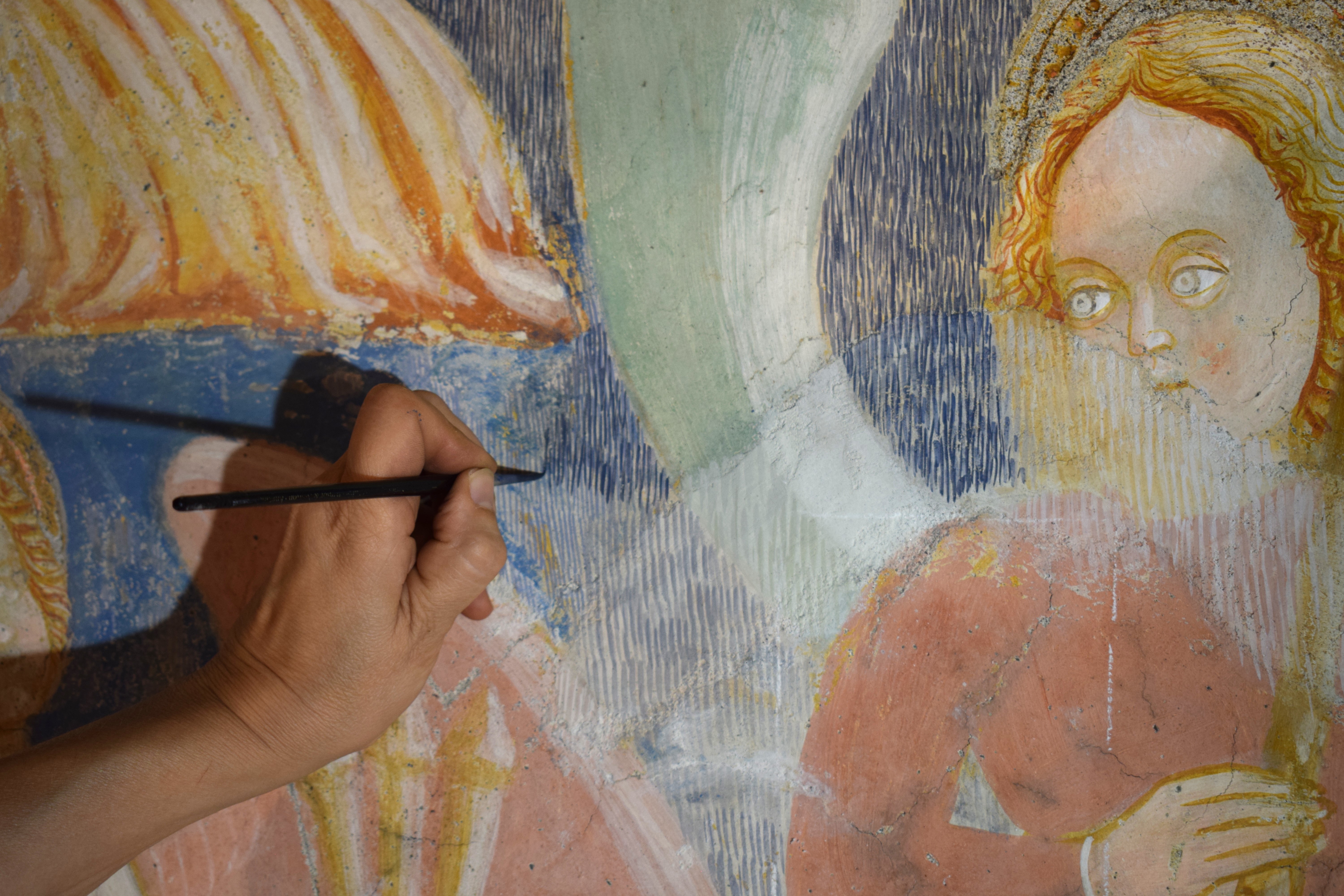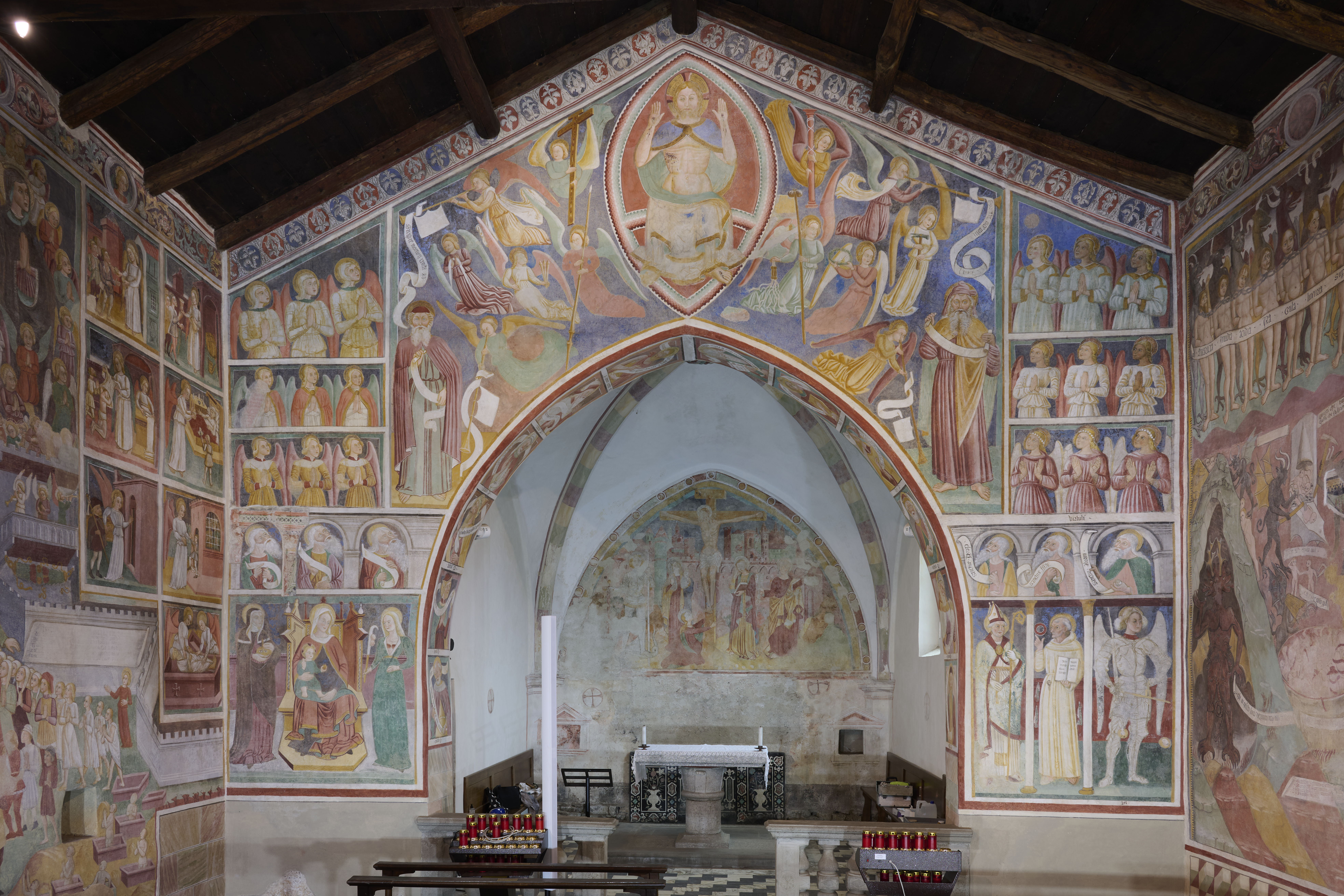 L’intervento di restauro ha riguardato il ciclo di affreschi interni risalenti alla metà del sec. XVI. Vi sono raffigurati: la Crocifissione nell’abside, Cristo Pantocratore con teorie di angeli e santi sull’arco trionfale, il Paradiso e l’Inferno lungo le pareti della navata.